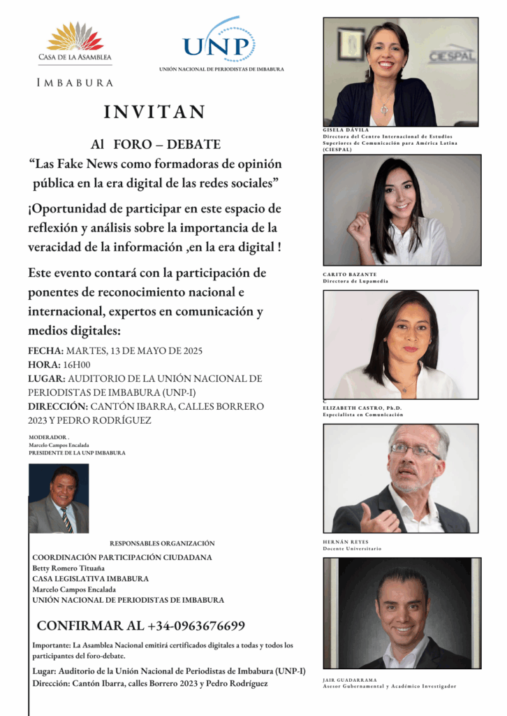 La Casa legislativa de Imbabura de la Asamblea Nacional de la República de Ecuador, en coordinación con la Unión Nacional de Periodistas de Imbabura (UNP-I), invitan al Foro-Debate “Las Fake News como formadoras de opinión pública en la era digital de las redes sociales”, que se llevará a cabo el próximo 13 de mayo a las 16H en la sede de los periodistas en la ciudad de Ibarra.
