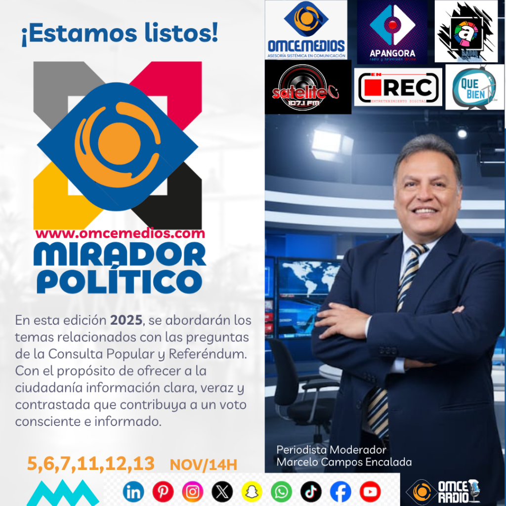OTAVALO.- La Plataforma Intercultural OMCEmedios RadioTV ,de Otavalo en producción con Radio TV , En REC, Apangora TV, Qué Bien TV, y las redes de radios Armonía y Satélite Radio, junto con diversos medios y plataformas digitales aliadas, anuncia el inicio del programa “El Mirador Político”, espacio dedicado al análisis y diálogo democrático.
